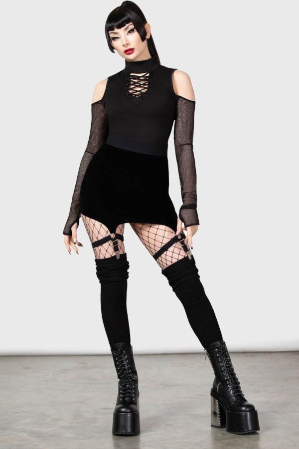 Rethink the classics and fall into the ‘Cassandra’ mini skirt – crafted from smooth and stretchy crushed-velvet, for a flattering fit and ultimate comfort. With a wide waistband and statement suspenders with an adjustable leg choker. An easy go-to piece that is oh-so-versatile! Sweet!