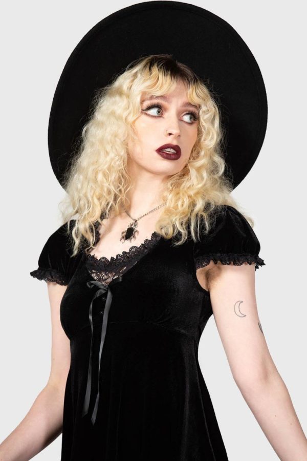 Real-life [baby]doll dress with some romantic detailing – bringing you a perfect balance of sweetness to the dark abyss. ‘Heather’ is an ultra-soft stretch-velvet dress with a cute cap sleeve, delicate lace-trim accents and low neckline with decorative buttons. Statement satin lace to the front and back for some added drama. Purrfect for play-dates, picnics under the moon and epic festival lineups alike!