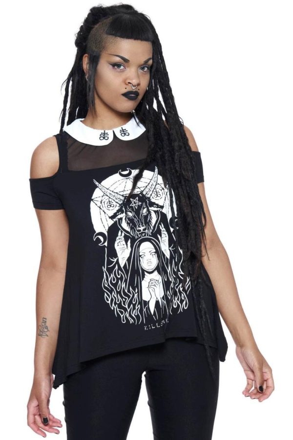Elevate your thinking and levitate to a new level. The ‘Nunsense’ collar top is a must-have wardrobe staple, constructed of stretchy fabric and with a light mesh panel for a flattering and comfortable fit. Complete with contrasting collar, cold shoulders and statement print. Easy to dress up or down depending on your mood/moon.